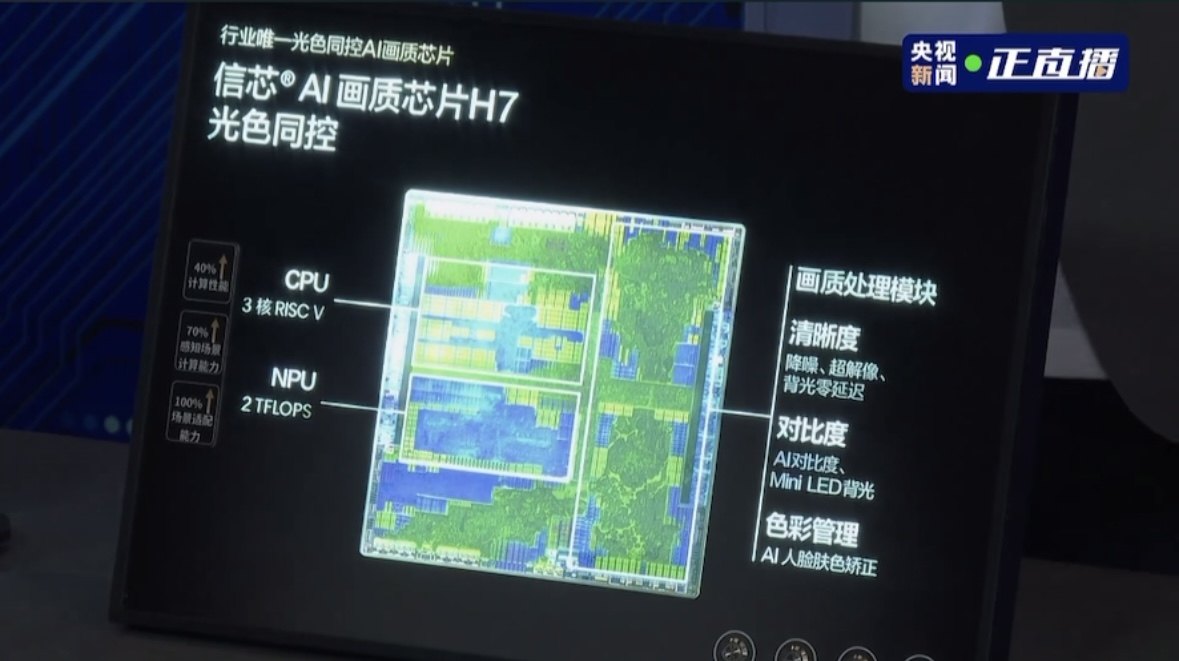 光有好背光还不够,得有“超级大脑”来指挥才行——海信U7S Pro藏着两颗自研的“硬核芯片”,这才是它的“性能密码”。第一颗是信芯AI画质芯片H7,行业首创RGB光色同控算法。要知道,一台电视有上万个彩色灯珠,每一帧画面都得在百分之一秒内,精准算出每个灯珠该亮多少、该是什么色,传统电视的集成芯片根本扛不住这种“指数级计算量”。而这颗信芯H7芯片实现了行业量产最高3 x 10240分区控制,是行业未量产画质芯片的近2倍,实现行业最高108bits控色精度,色彩细节更丰富,全面超越QD–OLED。第二颗是RGB-Mini LED发光芯片,全新升级后画面均匀度提升30%,更通透;降低42%有害蓝光,更护眼。