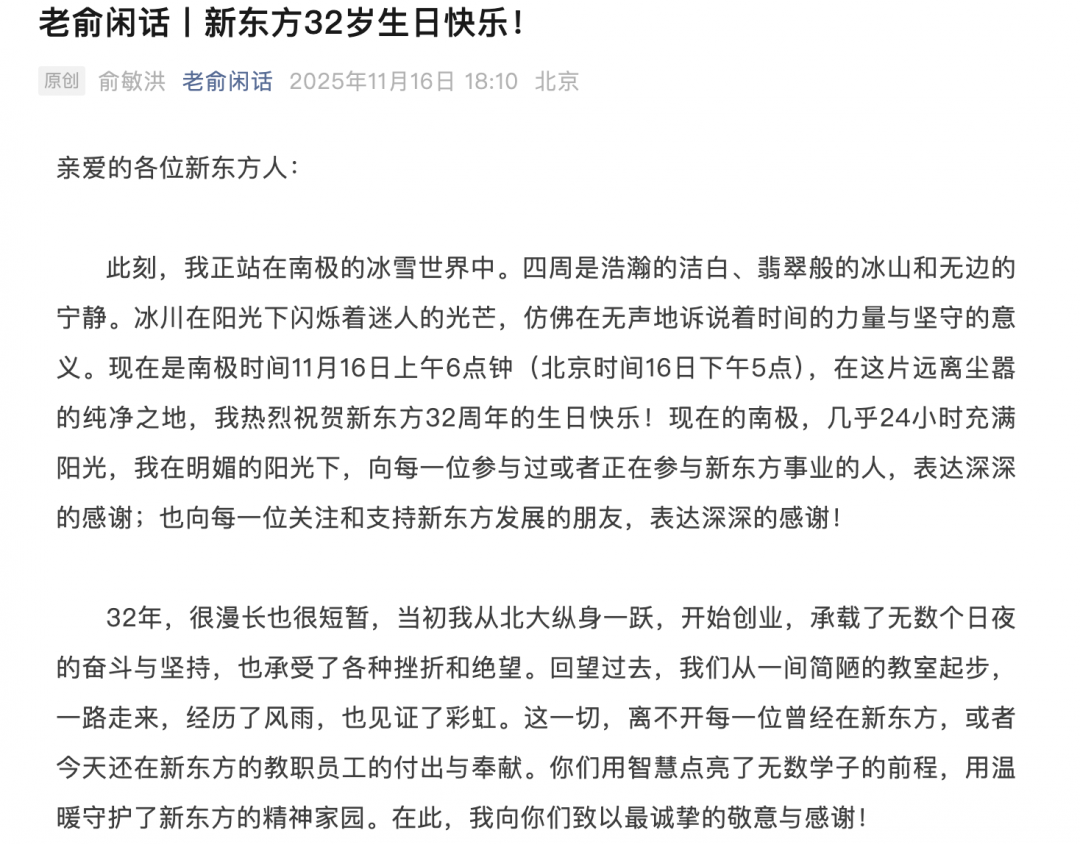 亲爱的各位新东方人:此刻,我正站在南极的冰雪世界中。四周是浩瀚的洁白、翡翠般的冰山和无边的宁静。冰川在阳光下闪烁着迷人的光芒,仿佛在无声地诉说着时间的力量与坚守的意义。现在是南极时间11月16日上午6点钟(北京时间16日下午5点),在这片远离尘嚣的纯净之地,我热烈祝贺新东方32周年的生日快乐!现在的南极,几乎24小时充满阳光,我在明媚的阳光下,向每一位参与过或者正在参与新东方事业的人,表达深深的感谢;也向每一位关注和支持新东方发展的朋友,表达深深的感谢!