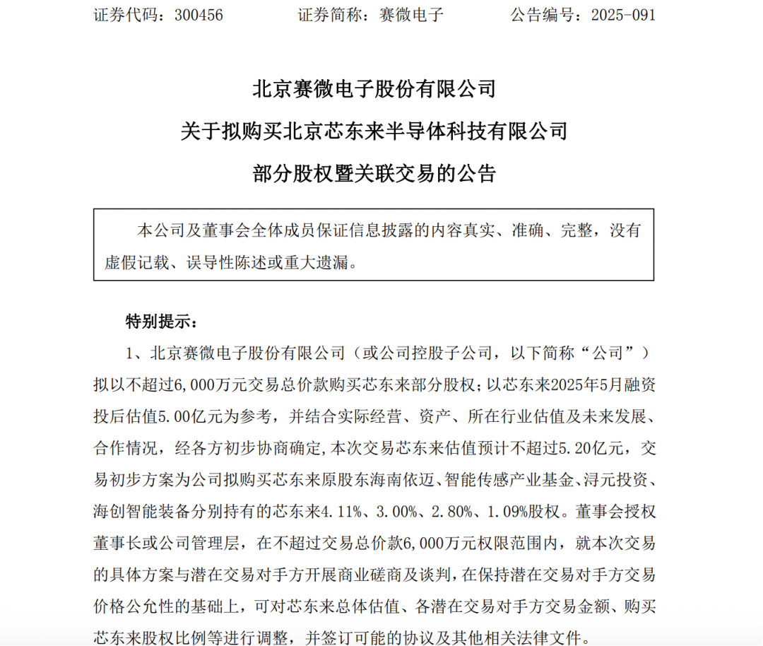 经各方初步协商确定,本次交易芯东来估值预计不超过5.20亿元,交易初步方案为赛微电子拟购买芯东来原股东海南依迈、智能传感产业基金、浔元投资、海创智能装备分别持有的芯东来4.11%、3.00%、2.80%、1.09%股权。