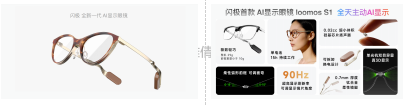 同期发布的“闪极 loomos AI显示眼镜 S1” (以下简称:闪极 S1)搭载“凤凰架构2.0”重新定义“全天主动AI眼镜”,通过钛合金超薄柔性镜腿实现可调曲度及轻量化。同时,闪极联合光峰科技“蜻蜓光擎实现”双眼异步显示与真3D。产品聚焦“主动AI提醒”,搭载全球首发硅基芯片级扬声器,整机重量29g,体感15g。