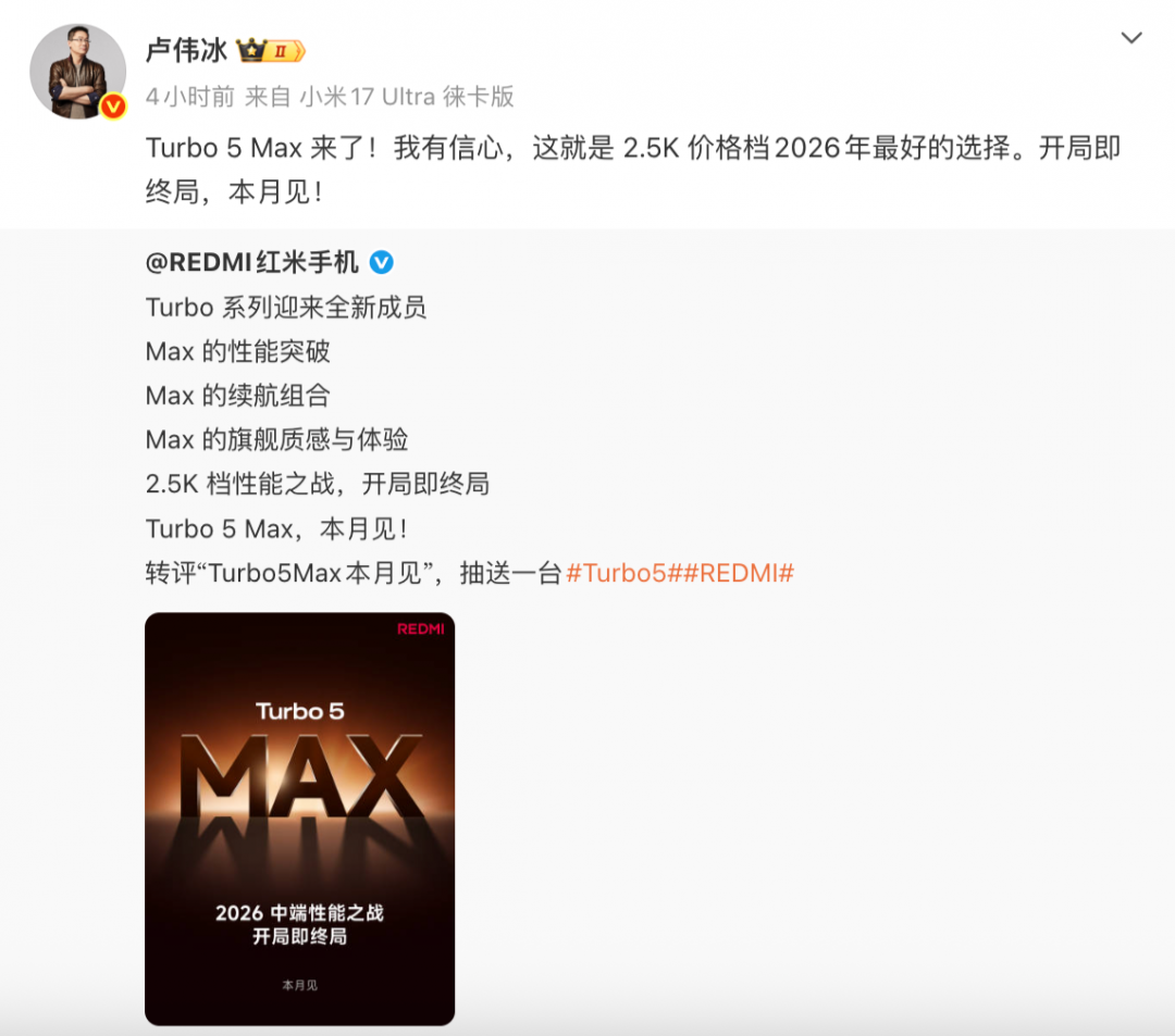 1月5日消息,今日,REDMI官方正式官宣了Turbo系列全新成员REDMI Turbo 5 Max,新机将于本月正式上市,定位2.5K价位段性能旗舰。