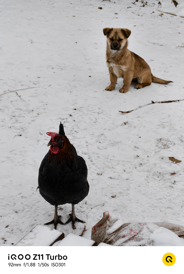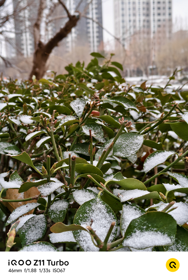 此外,这款手机支持4倍无损变焦,我们在92mm等效焦段下拍摄远处景物时,细节依然清晰,没有明显的模糊和噪点,可见其成像能力并非简单的缩放所企及。由于iQOO Z11 Turbo本身并没有提供微距功能,但是在4倍无损长焦的加持下,同样可以实现长焦微距的效果,实拍雪后竹叶脉络清晰可见,雪凝冰晶也同样呈现出不错的锐利度。