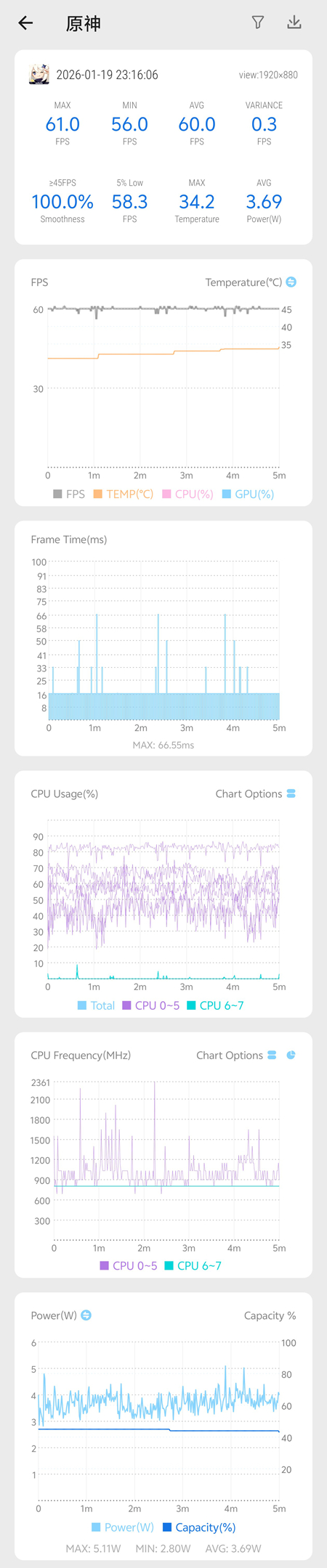 《原神》作为公认的 “手机性能杀手”,对硬件配置要求极高。iQOO Z11 Turbo 在原生最高画质 + 60 帧模式下,连续跑图5分钟,平均帧率达到 60.0FPS,5% Low 帧 58.3FPS,仅在对话场景切换时出现极其微小波动。