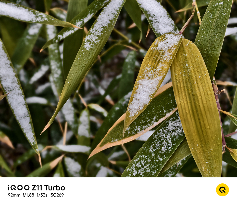 此外,这款手机支持4倍无损变焦,我们在92mm等效焦段下拍摄远处景物时,细节依然清晰,没有明显的模糊和噪点,可见其成像能力并非简单的缩放所企及。由于iQOO Z11 Turbo本身并没有提供微距功能,但是在4倍无损长焦的加持下,同样可以实现长焦微距的效果,实拍雪后竹叶脉络清晰可见,雪凝冰晶也同样呈现出不错的锐利度。
