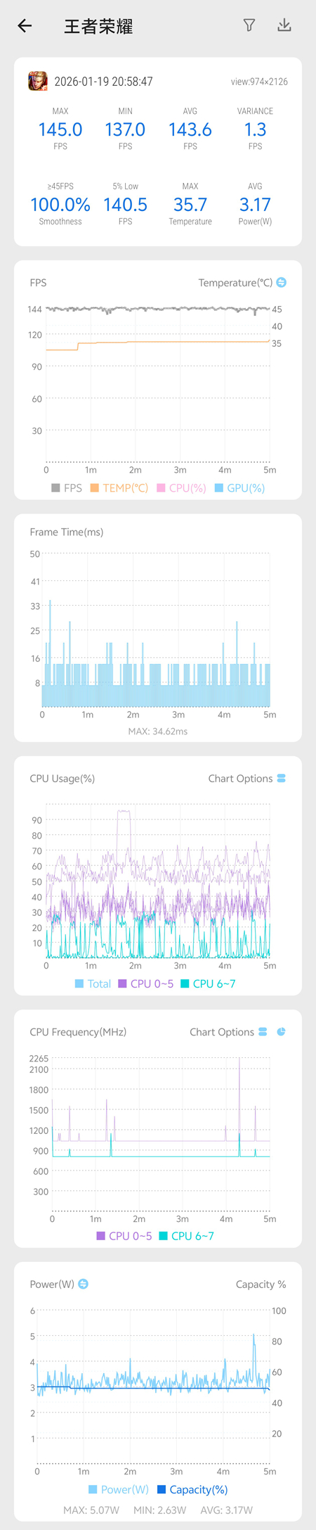 在《王者荣耀》中,该机原生支持 144Hz 超高帧率模式,测试时将游戏设置为全极致,并开启抗锯齿和水面光效,系统侧则开启Monster模式,5V5排位赛5分钟测试,实测平均帧率达到 143.6FPS,5% Low 帧高达 140.5FPS,平均功耗3.17W,全程未曾出现卡顿感。即便是特效满天飞的团战场景,画面流畅度拉满。