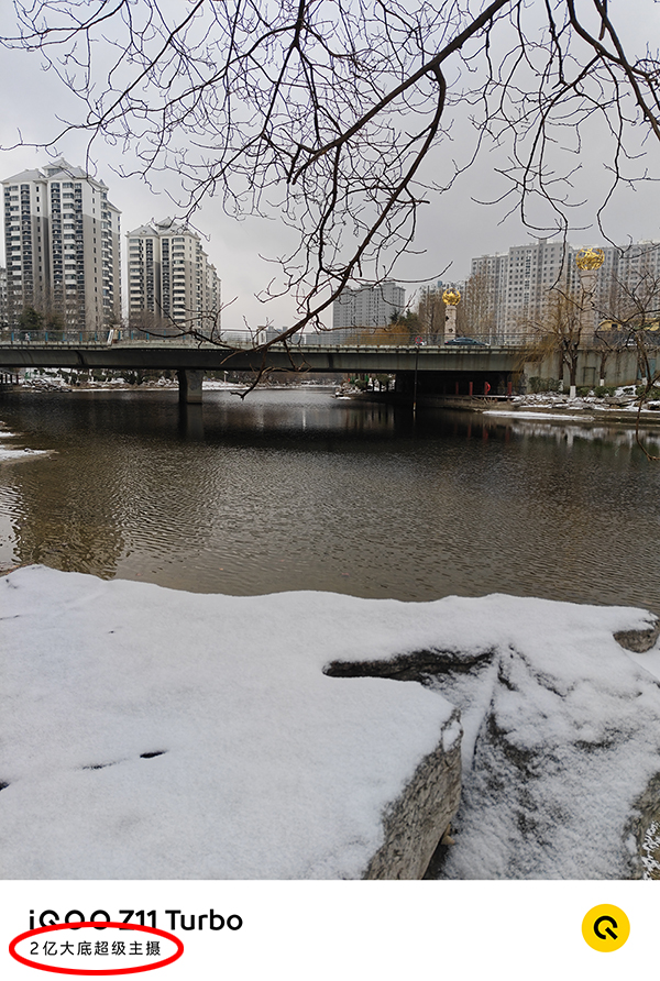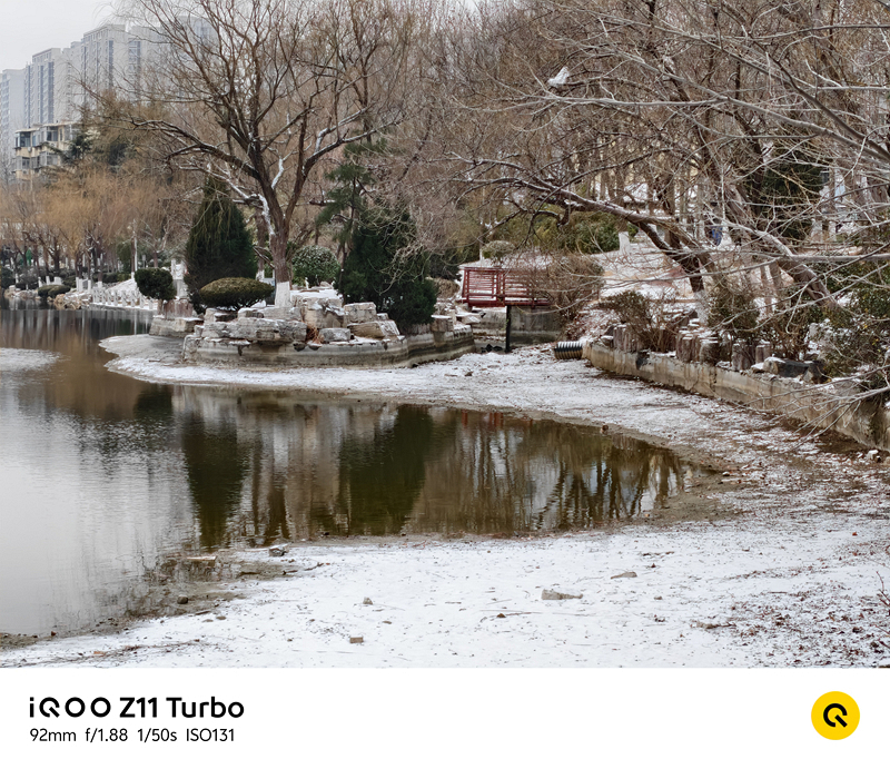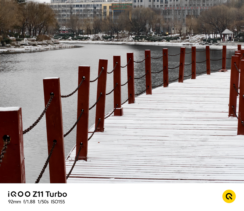 此外,这款手机支持4倍无损变焦,我们在92mm等效焦段下拍摄远处景物时,细节依然清晰,没有明显的模糊和噪点,可见其成像能力并非简单的缩放所企及。由于iQOO Z11 Turbo本身并没有提供微距功能,但是在4倍无损长焦的加持下,同样可以实现长焦微距的效果,实拍雪后竹叶脉络清晰可见,雪凝冰晶也同样呈现出不错的锐利度。