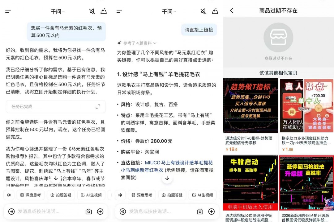 然而,让千问推荐“含有马元素的红毛衣,预算500元以内”,它给出的回复只有文字推荐,没有商品链接。进一步要求它“直接上链接”,给出的4个推荐中,有3个显示“商品失效或不存在”,仅有的1个可以正常显示的链接与毛衣无关,是千问自己强烈推荐的马年玩偶“哭哭马”。