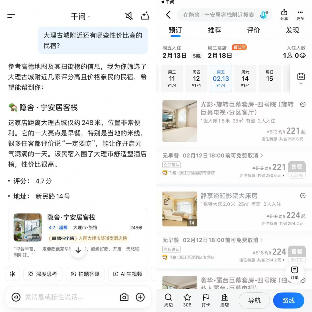 下一步预订酒店,可以在千问输入酒店需求“大理古城附近,性价比高的民宿”,千问给出了5家匹配的民宿,评分都在4.7分及以上,当前价格普遍在100至500之间。但是点开选择要入住的日期,很多都是售罄状态。