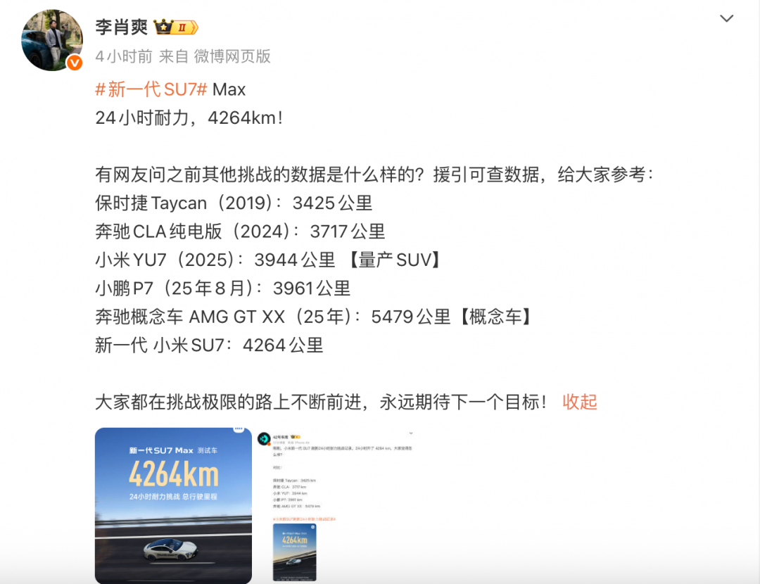 此外,新一代SU7 Max的挑战数据也超越了此前小米 YU7创下的3944公里纪录。