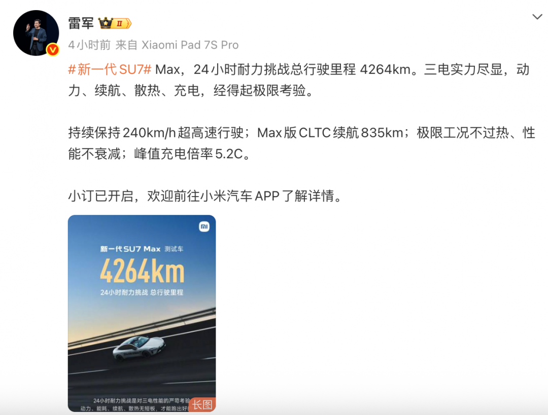 对此,雷军发文表示,小米新一代SU7 Max三电实力尽显,动力、续航、散热、充电,经得起极限考验。持续保持240km/h超高速行驶;Max版CLTC续航835km;极限工况不过热、性能不衰减;峰值充电倍率5.2C。