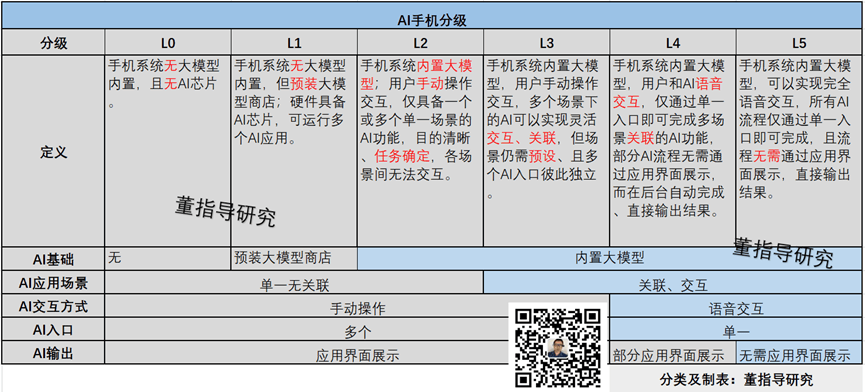 谈到打分,首先要定义标准。目前,市面相关的标准不多,暂且仍以我之前划分的AI手机L0-L5来看。
