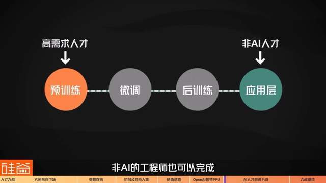 在整个生成式AI大模型的预训练-微调-后训练的过程中,有最大需求和最高要求的,就是可以参与预训练的人才,而到了应用层,非AI的工程师也可以完成。