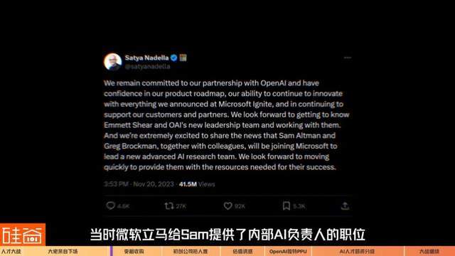 大家可能还记得,在2023年年底OpenAI董事会内斗的时候,Sam Altman一度被炒鱿鱼,当时微软立马给Sam提供了内部AI负责人的职位,之后更是大部分员工对Sam表忠心愿意追随Sam加入微软。